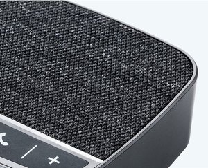 本体上部のスピーカーグリルにはファブリック素材を使用。また、天面部と側面には操作しやすい大きめサイズの電源/操作ボタンを配置し、ワンタッチでミュート可能なマイクミュートボタンも備える。