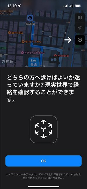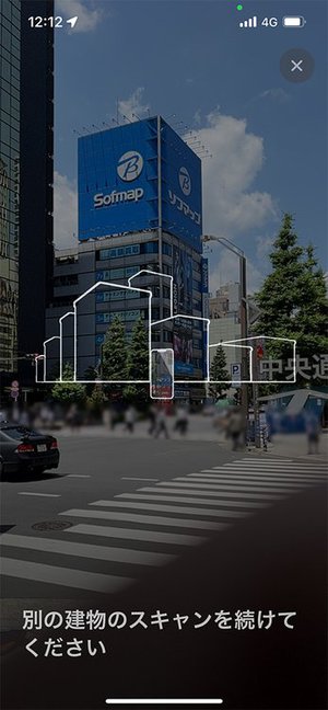 iPhoneのカメラを現実の風景にかざして「建物のスキャン」を行うと、AR表示の画面に通りの名前や方向指示が出てくる。画面には矢印とともに「こちらの方を見てください」という指示も表示されている。何となく違和感を感じたが和訳の問題だろう。英語の表記は「Look this way」だ。機能を踏まえたうえで日本語にするならば「こちらの方向に進んでください」とした方が自然な気がする。