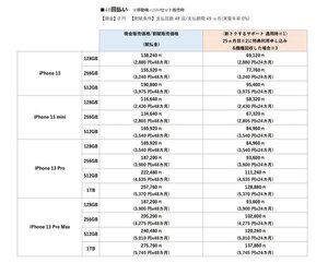 価格改定の一例として、auではiPhone 13(128GB)の機種代金(税込)が現在115,020円のところ、137,295円になっている。NTTドコモは111,672円から138,380円に。またソフトバンクは138,240円に値上げされた。