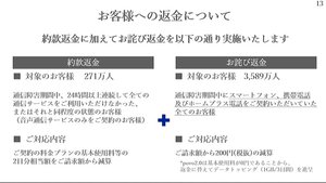 また契約約款において、271万人のユーザーに対して、契約している料金プランの基本使用料などの2日分相当額を請求額から減算。通信障害の期間中、24時間以上連続してすべての通信サービスを利用できなかった、もしくは同程度の状態だったユーザーのうち、音声通信サービスのみの契約者が対象となる。