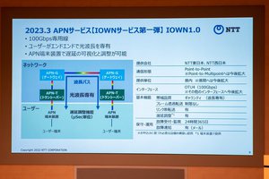 IOWNとは、先進的な光電融合技術を活用したフォトニクス(光)関連技術となっており、ネットワーク通信においては2030年までに電源効率を100倍、伝送容量を125倍、エンドエンド遅延を1/200にしていくことを掲げる。まず、低遅延・大容量化を実現させる「オールフォトニクス・ネットワーク(APN:All-Photonics Network)」をIOWN1.0にて提供する。