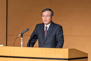 内覧に先駆け、会場では同社代表取締役社長の島田明氏による基調講演を実施。2023年3月よりサービス提供を予定する「IOWN1.0」による、ネットワーク通信のトラフィック増や、消費電力増、ネットワークの遅延などといった課題を解決するビジョンを語った。