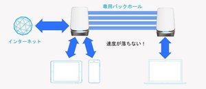 シリーズの代名詞ともいえる、サテライトと接続する専用のバックホール機能も進化させた。通常の非専用バックホール接続ではデバイスが接続される度に帯域が圧迫され、ルーターとサテライト間の接続速度や、サテライトとデバイス間の通信速度が低下してしまうが、専用のバックホール接続帯域を確保ことでこれを排除。無線では5GHz帯の接続で最大2402Mbps、有線ではサテライトと2.5Gマルチギガポートおよびギガビットポートを活用した接続により、障害物が多いロケーションにも柔軟に対応する。