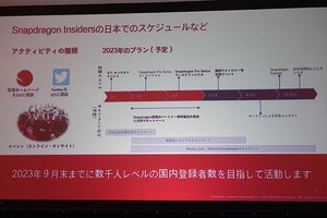 なお、須永氏のスピーチは主に携帯電話/スマートフォンを想定した内容だったが、前出の根本氏によれば、サウンドバーなどのオーディオ分野や車載機器、XR、PCなどそのほかの分野でもSnapdragonを積極的に展開していきたいとのこと。Snapdragon Insidersの登録者数についても、「海外では約820万人の会員がいるので、日本でもまずは9月末ごろまでに数千人、将来的には5万人、10万人という規模を目指していきたい」とした。