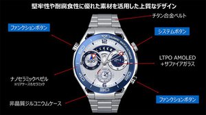 同社が展開するスマートウォッチのハイエンドモデル「GTシリーズ」を上回る性能や、デザイン性を兼ね備えたとする新フラグシップモデル。本体カラーは海外向けにはボヤージュブルーとブラックの2色を展開するが、日本国内向けにはボヤージュブルー1色のみを展開する。