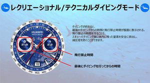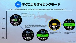ダイビングモードは、シリンダー無しで潜る素潜り向け「フリーダイビング」、水深40m以内のスキューバダイビング向け「レクリエーショナルダイビング」、水深40m以上のダイビングも考慮し、酸素中毒や減圧症を防止する必要がある「テクニカルダイビング」、深度や時間など基本データのみを盤面に表示させる「スキューバダイビング」を搭載する。