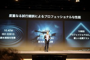 発表会にはフリーダイバーとして活躍する原 哲雄氏がゲスト登壇。すでに何度かWATCH Ultimateをダイビングで使用したという原氏は、「ダイビングでは途中の深度や、その都度自分がいる正確な深度を把握し、理解することが非常に重要」だと説明。WATCH Ultimateによる各種通知は「バイブレーションの振動はウェットスーツ越しでも十分に伝わる、アラーム音も深いの水中でもしっかり聞こえた」とのことで、ダイビングサポート機能の精度の高さを実感したという。