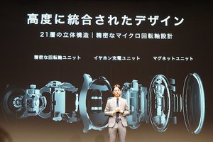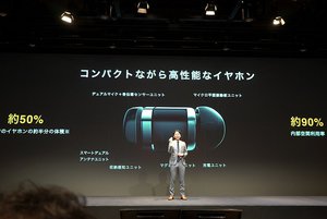 4つのマグネットと自社開発のマイクロ平面振動板ドライバーを搭載。「イヤホンが小さくなったことで音質面を心配されるかもしれないが、本機は音質面でも妥協していない」と片山氏。イヤホンの内部空間利用率が90%で、必要な部品を隙間なく詰め込むことで、コンパクトサイズと妥協なき高性能を両立しているという。
