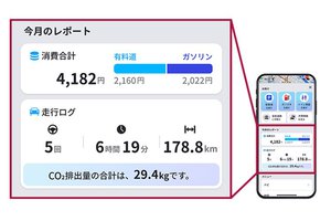アプリ内に「お助けボタン」を設置し、ボタンを押すと、駐車場やトイレ施設の検索、渋滞情報の確認や並走道路への切り替えなどのアシスト機能が利用できる。このほか、走行履歴から取得したログデータをもとに、CO2排出量や毎月のガソリン代金や高速道路料金も表示する。