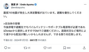 Anker JapanのCEOである猿渡 歩氏も、1月1日にX(旧Twitter)で、石川県能登地方を震源とする地震の被害を受けた自治体に対して、モバイルバッテリーやポータブル電源を提供すると投稿。必要な自治体は、DMで自治体名や担当者名、連絡先、製品の希望や台数などを記載して連絡してほしいと呼びかけている。
