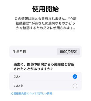 実際に「ヘルスケア」アプリで使用開始しようとすると、生年月日や心房細動の診断歴が聞かれ、診断されたことがあると回答しないと機能をオンにできない。