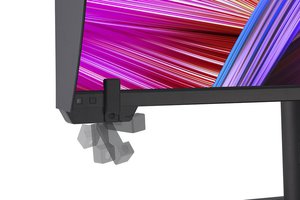 表示機能として、照明の明るさまたはモニター前のユーザーを認識して自動的に輝度調整するインテリジェントセンサーを搭載。音声面では3W+3Wのスピーカー、および3.5mmヘッドホン出力を内蔵する。スタンドは-5〜23度のチルト、左右30度のスイーベル、90度のピボット、100mm幅の高さ調整に対応する。スタンド含む外形寸法は727W×601H×245Dmm、質量は13.8kg。