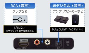 HDMI信号から音声信号を分離し、HDMI入力を持たないアンプやスピーカーに向けて光デジタル/RCAアナログ出力できるHDMIオーディオ分離器。光デジタル/RCAアナログ出力の切り替えは、本体に備えたスイッチからワンタッチで操作でき、ケーブルの挿し替えは不要となっている。