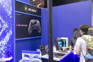 また、数々のミニチュア復刻ゲーム機やミニチュア復刻PC「X68000 Z」を手掛ける(株)瑞起のコーナーでは、自社ブランド “EVOTOP” の第1弾製品となるゲームコントローラーを参考展示。インテルブース内の各ブランドのPCと接続して試遊できる。