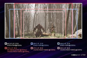 これにより、高精細な映像美を堪能して高い没入感でゲームを楽しむなら5K2K/165Hzを44.5型の画面フルに使用、高速な表示が求められるFPSやアクションゲームを楽しむならフルHD/330Hzを24インチで表示、などゲームジャンルや好みに応じて映像表示を自由にカスタマイズできる。
