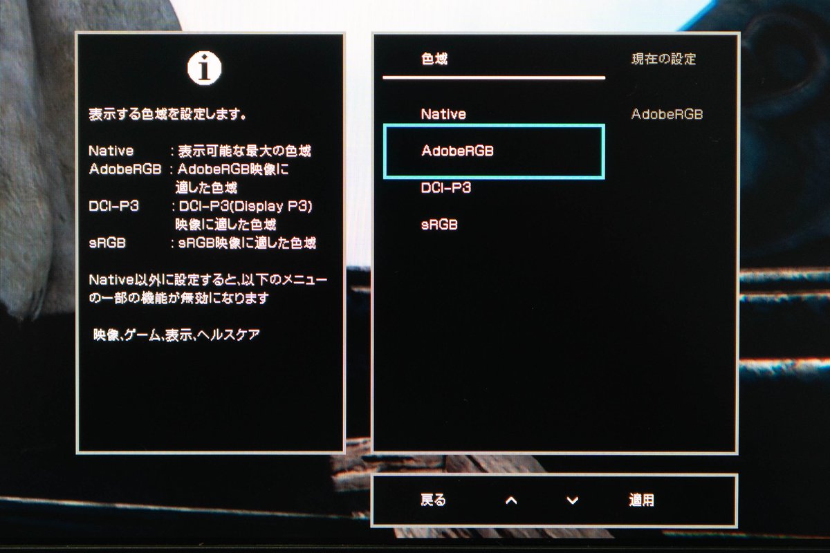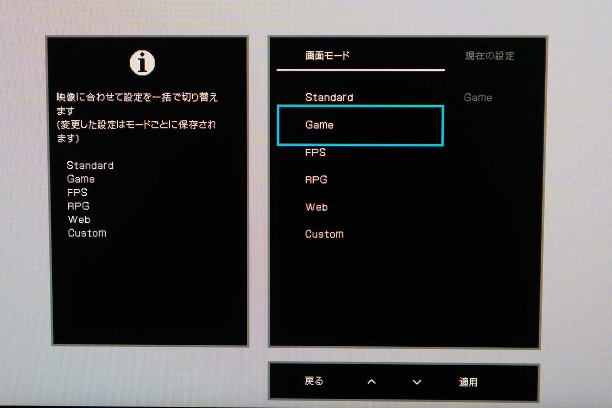 各ゲームジャンルや映像コンテンツに合った「画面モード」を用意しており、Game/FPS/RPG/Web/Standard/Customといったモードが選択できる。加えて、ブルーライトを低減させる「ブルーリダクション2」もフォローする。