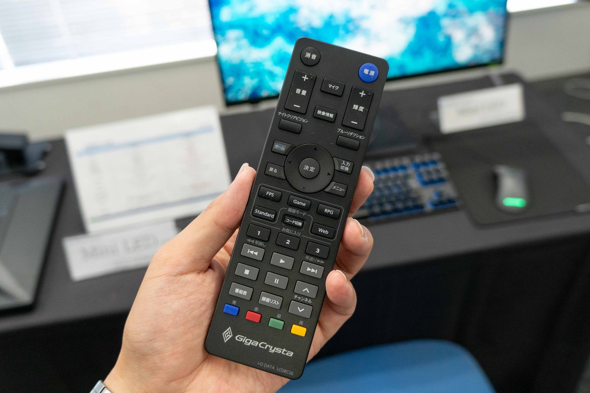 LCD-GDQ271JLAQでは、改めてリモコンを付属している。前モデルの発売時、多くのユーザーから本体操作用リモコンを要望する声があり、それに応えるかたちとなった。リモコンでは入力切替や音量調整、メニュー設定の操作はもちろん、ゲームジャンルに合わせて映像モードをワンタッチで選択できるといったゲーミングモニターならではのボタンを備えている。