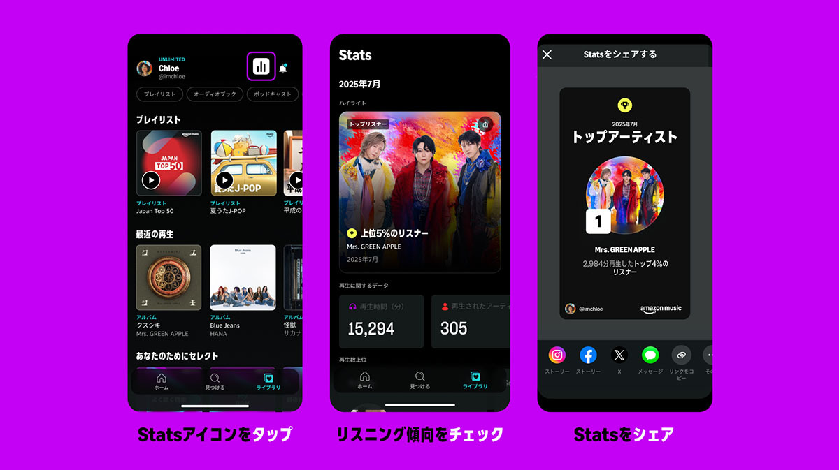 Amazon Musicに新機能「Stats」。自分の再生傾向を数値で確認、「トップリスナー」バッジ表示も