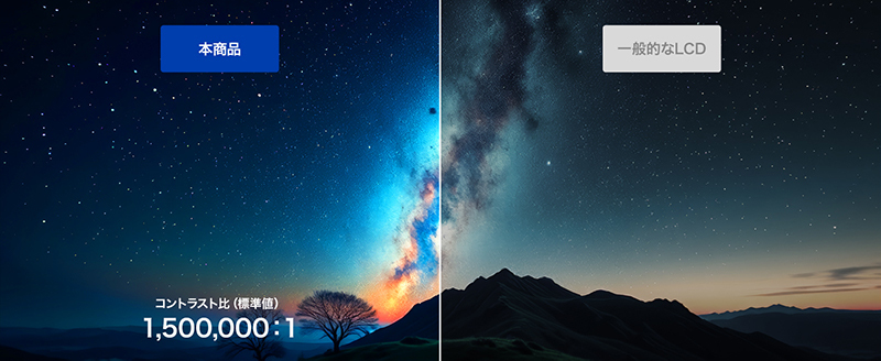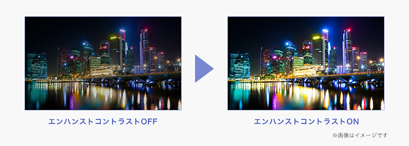 機能面では、映像の階調をコントラストが上昇するように調整して映像にメリハリを出す「エンハンストコントラスト」や、暗いシーンに隠れた敵もより鮮明に映し出す「ナイトクリアビジョン」、DVDなどのSD画質(720×480)の解像感を大幅に向上させる「超解像技術」などをサポートする。