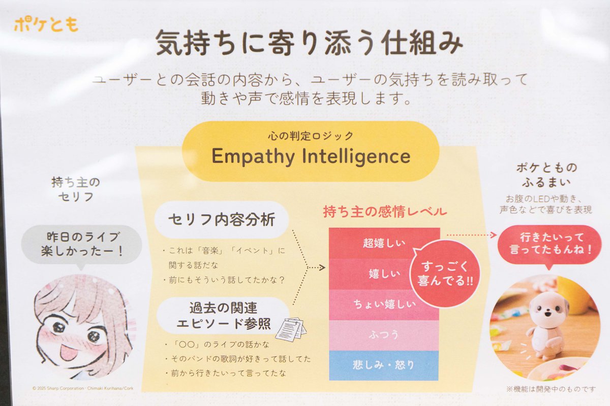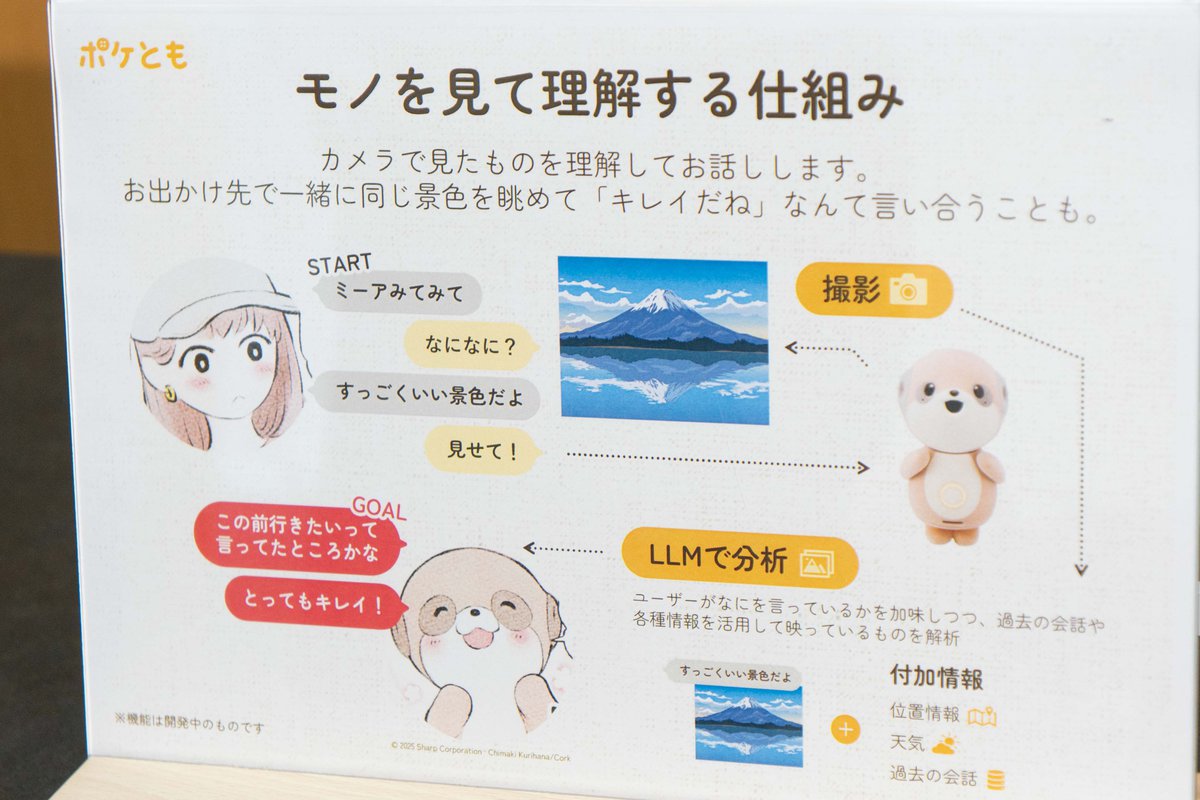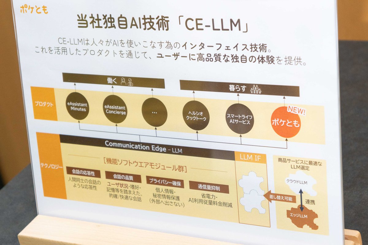 ポケともは、エッジデバイスにAI技術を搭載し、必要に応じてクラウドAIも併せて活用することで、シームレスかつ快適なコミュニケーションを実現するというシャープ独自のAI技術「CE-LLM」が導入されていることがトピック。