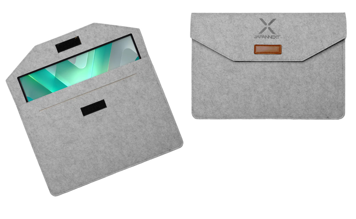 外形寸法は218H×315W×13Dmm、本体重量は約0.61kg。2年間のメーカー保証も付属する。 持ち運び時に便利なフェルトケースも同梱する。
