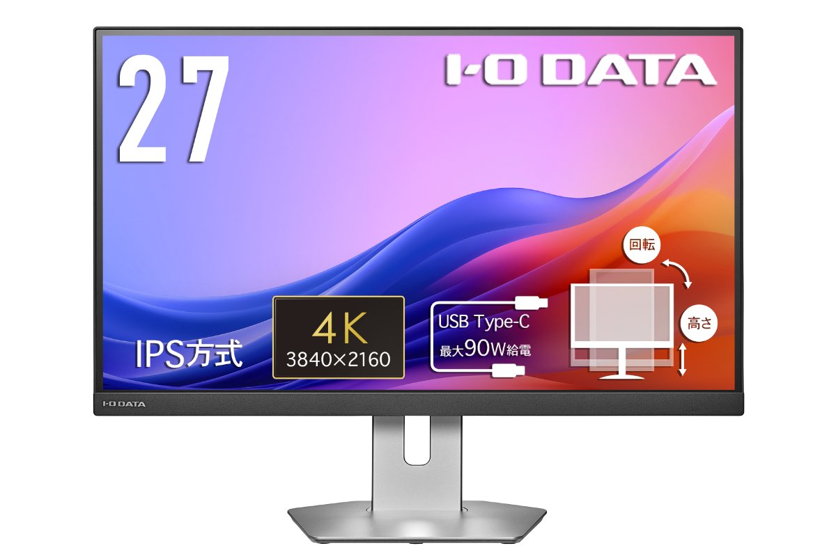 アイ・オー・データ、PCへの給電と映像出力をUSB-Cケーブル1本で行える27型4Kディスプレイ