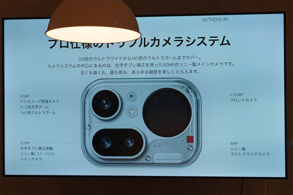メインカメラには、光の取り込み量が多いソニー製の次世代センサー「LYT700c」を採用。光学式手ブレ補正(OIS)を備え、非常に明るく鮮明な写真が撮影できるという。また、50MPの3.5倍望遠ペリスコープレンズは強力な処理能力と組み合わせることで、三脚なしの手持ちでも140倍ズームでの撮影が可能だとしている。