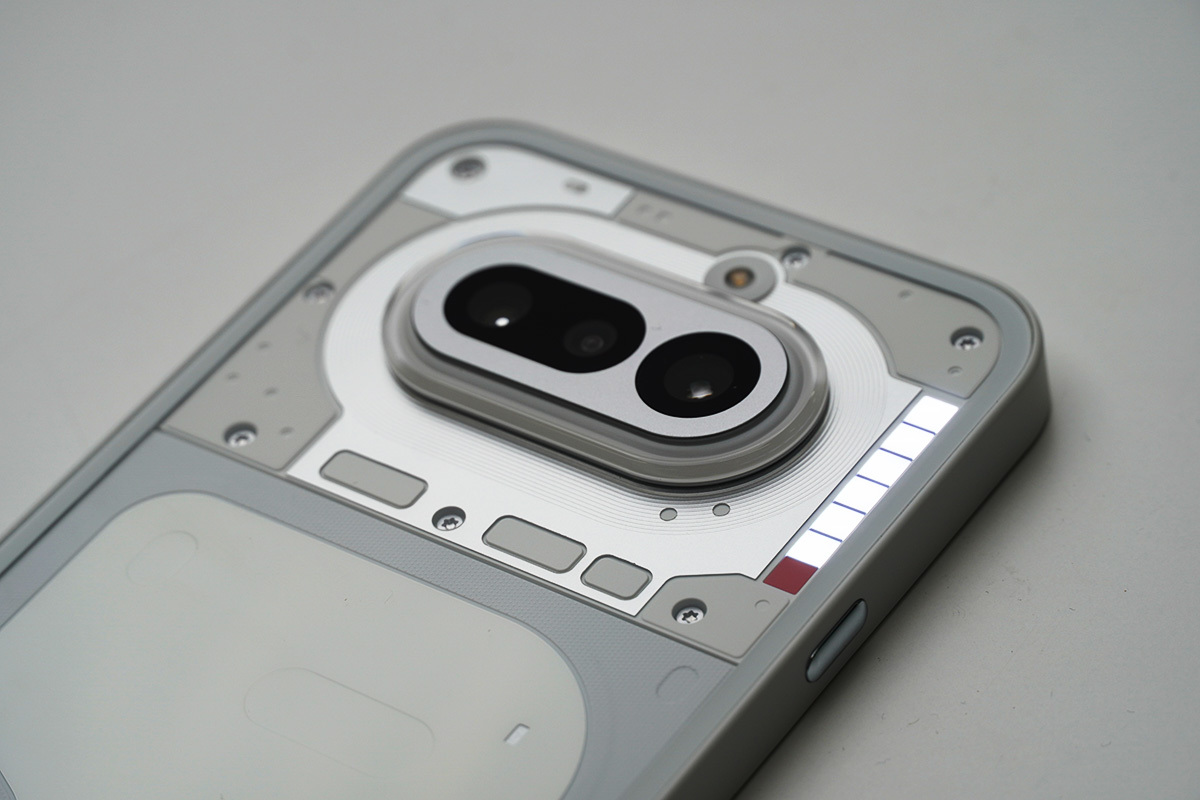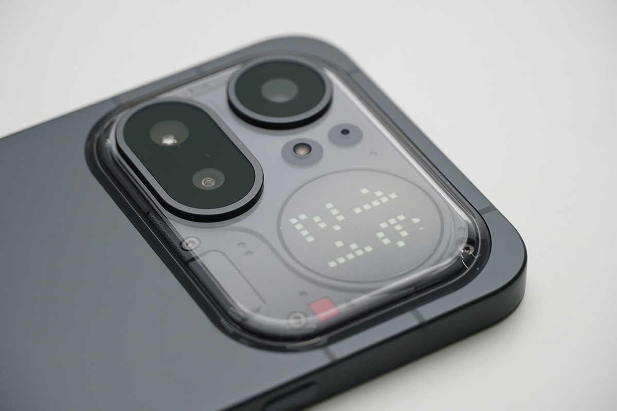 背面には上述のとおりPhone(3)から「Glyphマトリックス」を継承。形状が少し変わり、ドットの間隔を少し開けて配置することによりインベーダーのような表現を目指したとしている。輝度の向上した137個のミニLEDにより、遠くからでもタイマーなどが見やすくなったとアピールしている。
