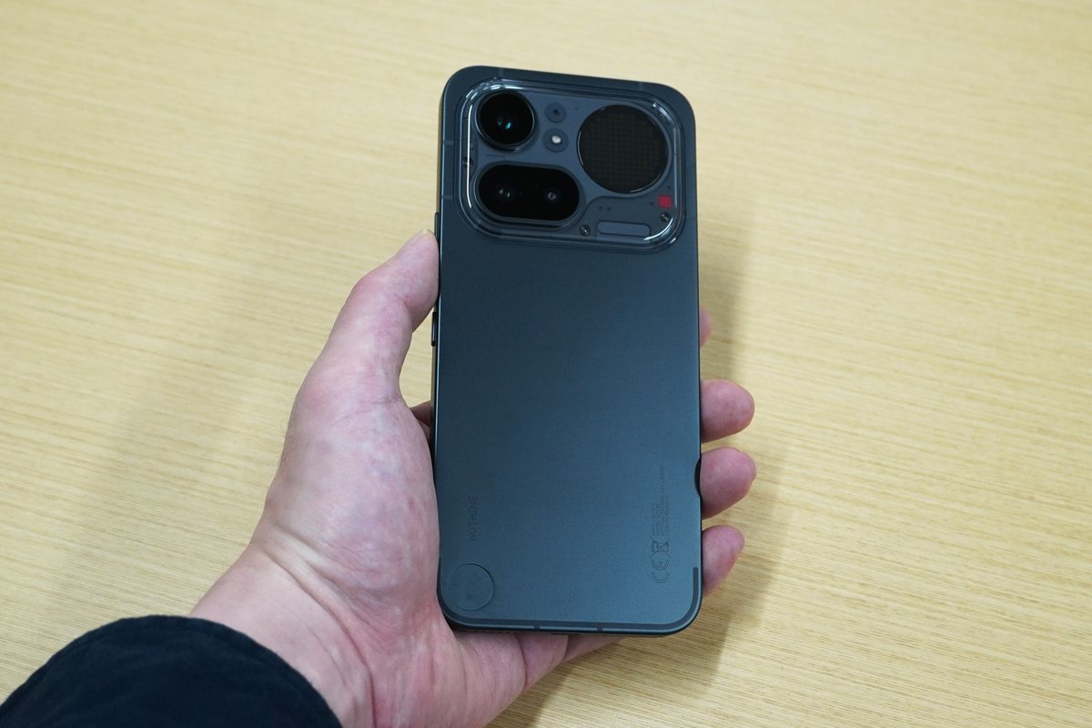 「Phone(4a) Pro」は、Phone(4a)をベースにさらなるスペックアップを図ったモデル。筐体には航空機グレードのアルミニウム製ユニボディを採用。カメラ周りにシースルーデザインを継承し、メカニカルな内部構造を覗き見ることができる。