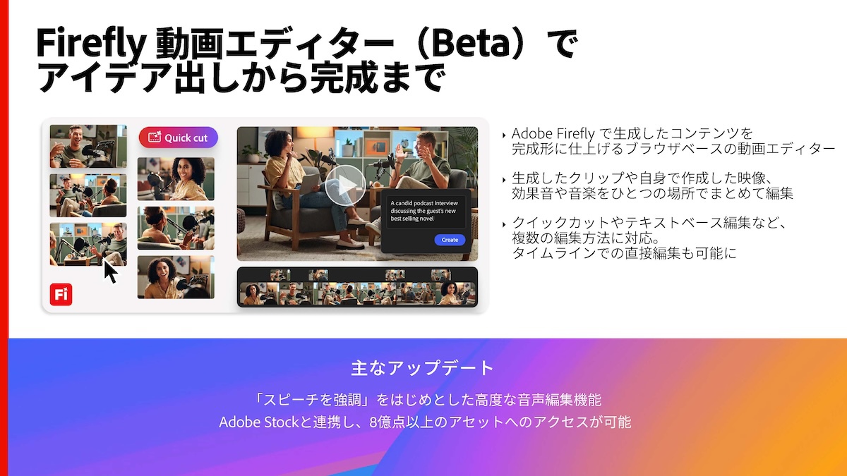 生成AI機能のAdobe Fireflyでは、生成から編集、仕上げまでをブラウザー上で完結可能な「Adobe Firefly 動画エディター」に新機能を追加。Adobe PremiereやPodcastでも展開している音声クリーンアップ機能「スピーチを強調」を含むオーディオ機能の強化を実施する。