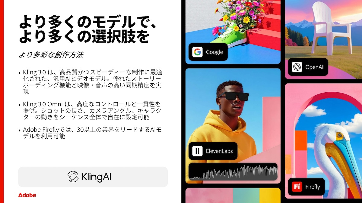 - Adobe Firefly:動画編集機能の強化、新たなビデオモデル「Kling 3.0」および「Kling 3.0 Omni」の追加