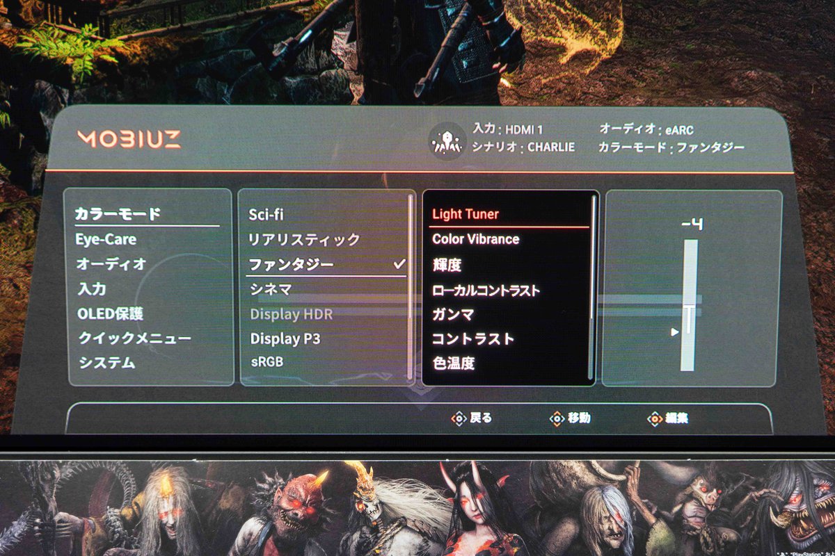 鮮やかなゆらめく炎やエフェクト、石やレザーなどのテクスチャー感を再現したい場合は「ファンタジー」、鮮やかなネオンライトや近未来な雰囲気、暗闇に映えるメタリックな質感などは「Sci-Fi」、そして顔などのナチュラルな彩度や生き生きとしたコントラスト表現を施したい際は「リアリスティック」のモードといったように、ゲームタイトルに合わせて最適な映像表現に調整できる。