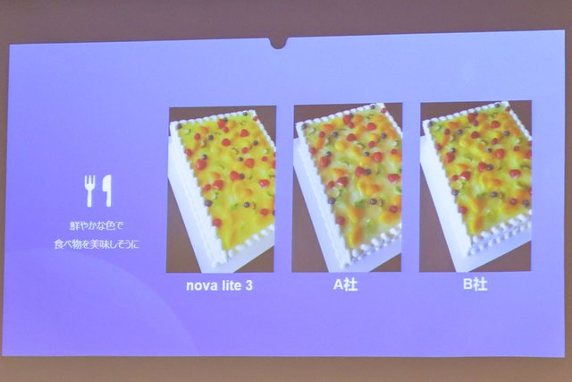 AIカメラで撮った写真を他社と比較。例えば食べ物では、自動的に鮮やかに調整されるという