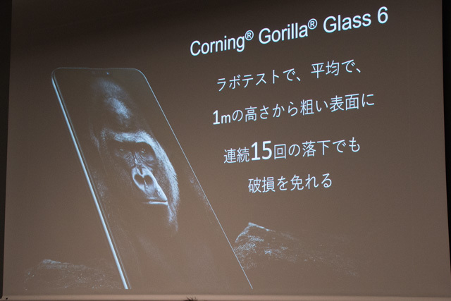 更に耐久性の向上した「Gollira Glass 6」を採用。発表会会場では、実際にコーニング社のスタッフが衝撃を加える器具で耐久性デモを行った
