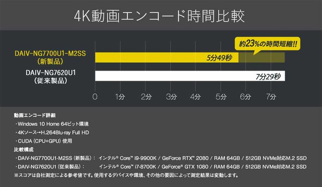 HOME > ニュース > モバイル/PCニュース クリエイター向けブランド「DAIV」から マウスコンピューター、4K制作も高速処理できる17.3型ノートPC。GeForce RTX 2080/4K液晶搭載 編集部:杉山康介 2019年03月25日 前の写真へ 同社の従来製品と比較し、4K 動画エンコード時間の検証において23%の高速化を実現したとのこと 前の写真へ この写真の記事へ 関連リンク DAIV-NG7700シリーズの詳細 DAIV-NG5800シリーズの詳細 マウスコンピューター