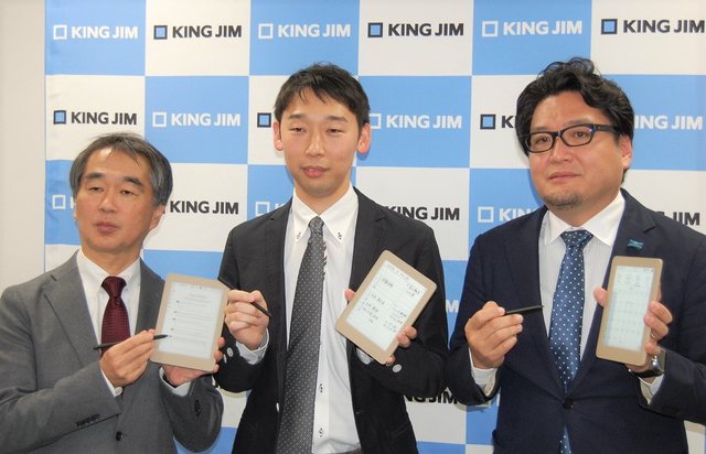 左から、(株)キングジム 常務取締役 開発本部長・亀田登信氏、電子文具開発部・東山慎司氏、(株)ワコム テクノロジー・ソリューション事業部 シニア・ディレクター 掛晃幸氏