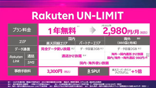 楽天モバイルの月額料金は「2980円で使い放題」。300万名を対象に一年無料で提供