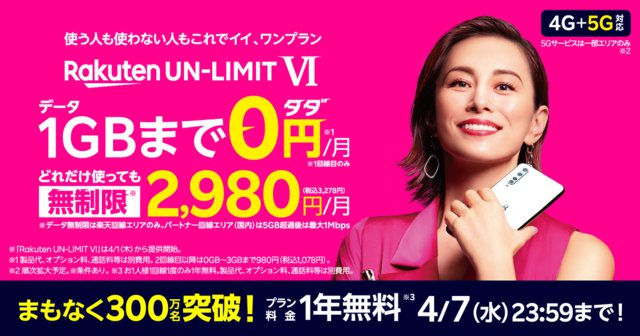 HOME > ニュース > モバイル/PCニュース 当初予定の300万名突破見込みのため 楽天モバイルの1年間無料キャンペーン受付、4月7日で終了 ファイルウェブ編集部 2021年03月01日 受付期間は4月7日まで この写真の記事へ 関連リンク 楽天モバイル