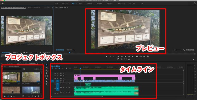 Premiere Proの基本編集画面。「プロジェクト」から「タイムライン」に配置したデータを「プレビュー」で確認する、という一連の流れとなる