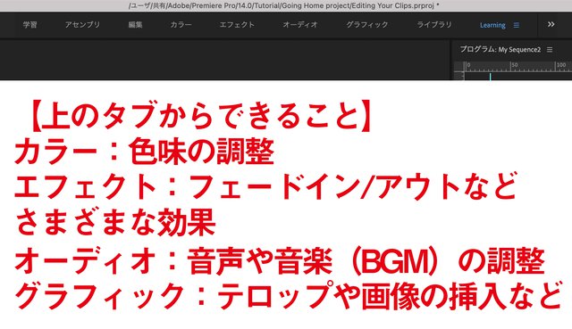 今回の動画編集では、上記4つの「タブ」を使用している。それ以外のタブは最初は気にしなくてOK!