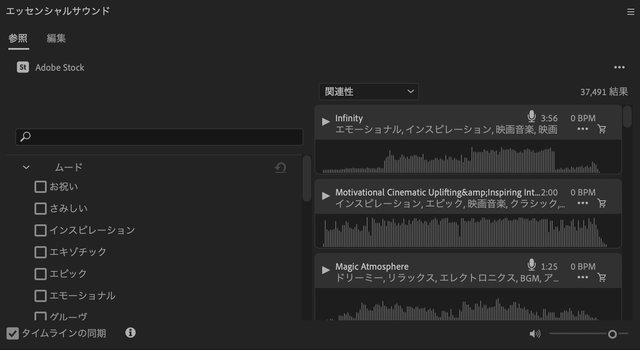 Audio Stockの選択画面。シチュエーションに合わせた音楽が色々用意されており、チェックマークで絞り込みが可能