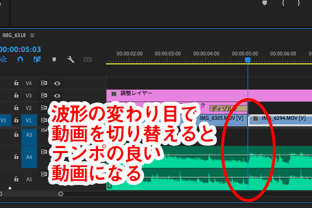 緑の「AUDIO」ラインの波形を確認しながら動画を切り替える