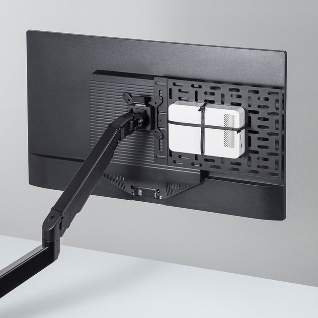 ディスプレイ裏のVESA規格ネジ穴を用いてプレートを固定。付属のバンドを用いて小型機器を取り付けすることが出来る