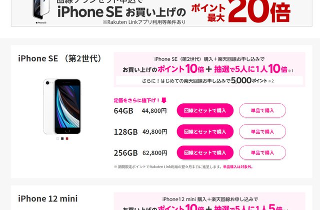 HOME > ニュース > モバイル/PCニュース 楽天市場での公式ストアで 楽天モバイル、iPhone 12やSEなど大幅値下げ。アップル公式ストアよりお得に ファイルウェブ編集部 2021年09月03日 公式サイトより この写真の記事へ 関連リンク 楽天モバイル 楽天市場店 iPhone販売ページ