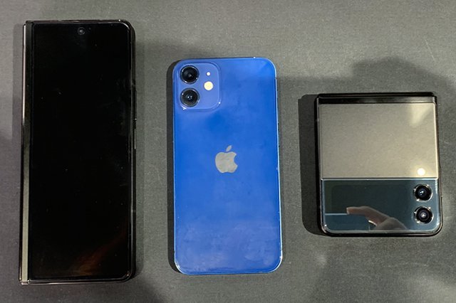 iPhone 12 miniと比較した様子。Galaxy Z Fold3 5Gはほぼ幅は同じ、Galaxy Z Flip3 5Gは幅は大きくなるものの、手のひらに収まるコンパクトさを実現