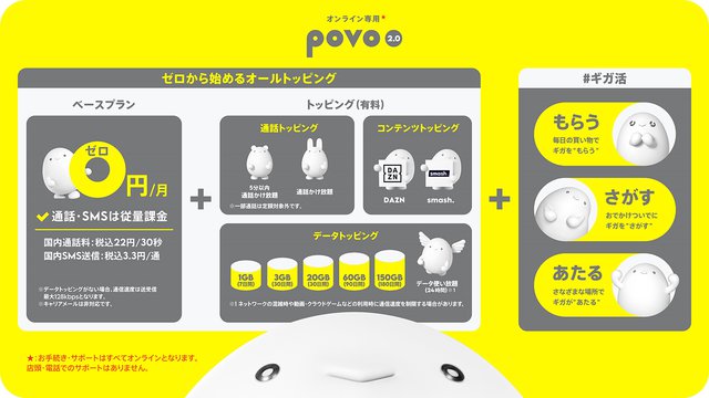 HOME > ニュース > モバイル/PCニュース 1GBから無制限まで6種類 auのオンライン専用プラン「povo2.0」。基本料0円+“トッピング”で容量追加 編集部:平山洸太 2021年09月13日 前の写真へ トッピングのイメージ。従来のpovo1.0と比較すると、20GB(30日間)は若干値上がりとなるが、60GB(90日間)購入の場合は月額換算で実質20GBを2,163円/月で利用できる 前の写真へ この写真の記事へ 関連リンク 本件のニュースリリース(povo2.0) 本件のニュースリリース(#ギガ活)
