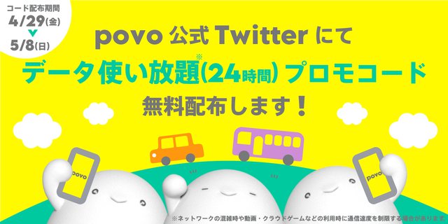 HOME > ニュース > モバイル/PCニュース 4/29から5/8の間に1回分利用可能 povo2.0、GW期間中に使える「データ使い放題(24時間)」無料コードを配布。4/29 10時より公式Twitter/インスタにて 編集部:川田菜月 2022年04月28日 GW期間中に使える「データ使い放題(24時間)」無料コードを配布 この写真の記事へ 関連リンク 本件のニュースリリース povo2.0公式Twitter povo2.0公式Instagram