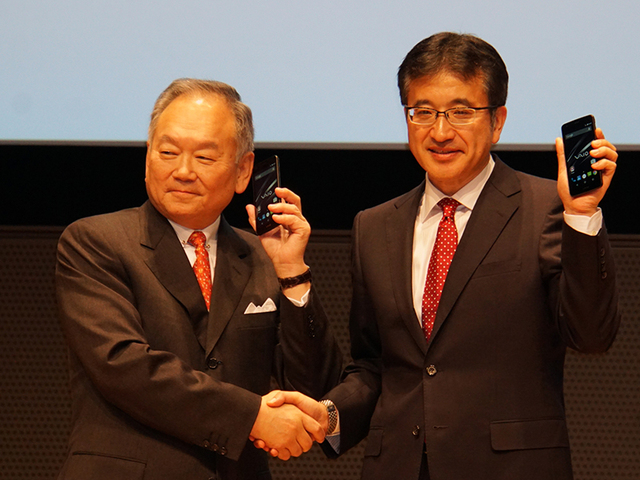VAIO Phoneを手に握手を交わす日本通信の三田社長とVAIOの関取社長