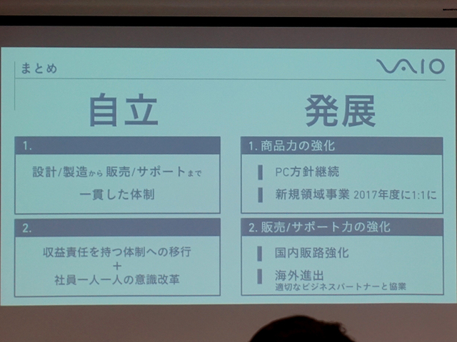 HOME > ニュース > モバイル/PCニュース スマホ事業も「もっと主体性を持って商品開発」 新生VAIOが海外進出。新規事業など“自立と発展”ビジョンを社長が説明 編集部:小野佳希 2015年08月19日 次の写真へ 自立と発展のために組織変更などを行った 次の写真へ この写真の記事へ 関連リンク VAIO 海外市場進出の詳細(PDF)