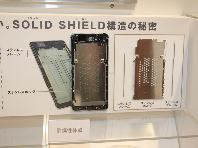 「F-01J」の内部構造。ステンレスフレームなどで強度を上げている